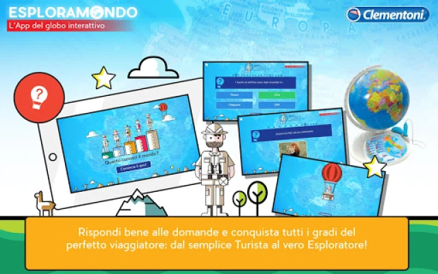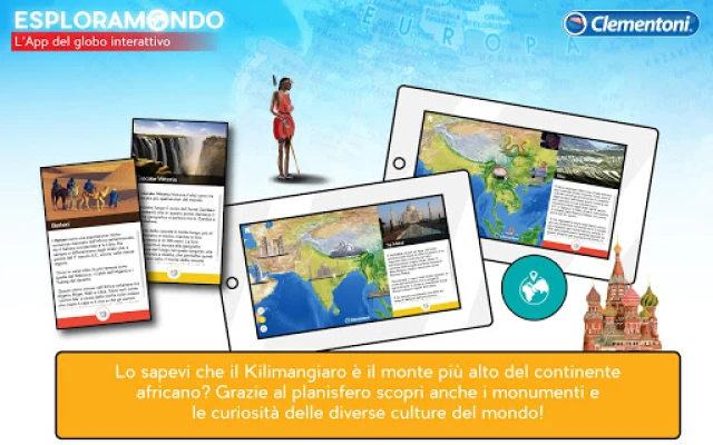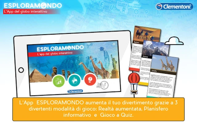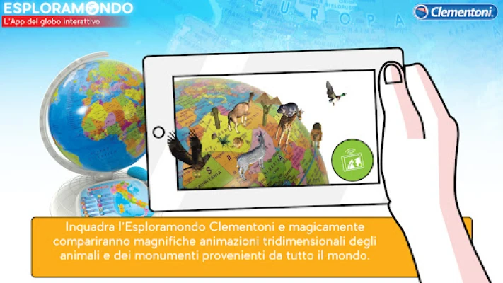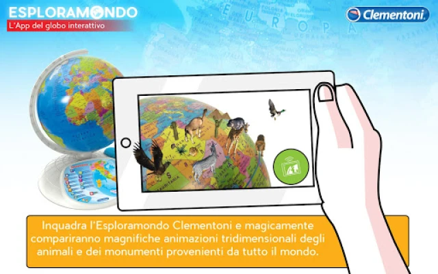 "Esploramondo App" syventää Clementoni Esploramondo -maapallon käyttöä. Se rikastuttaa tutkimista ja oppimista aikuisille ja yli 7-vuotiaille lapsille. Koe lisätty todellisuus 3D-eläimineen ja monumentteineen, tutki maapalloa interaktiivisesti ja haasta itsesi hauskoissa tietokilpailuissa. Laajenna tietämystäsi maailmasta!