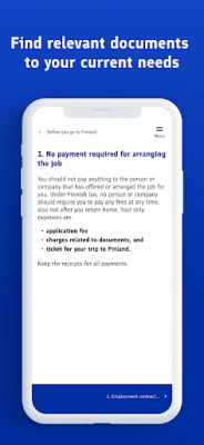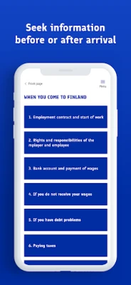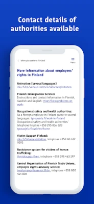 Selvitä helposti oikeutesi ja velvollisuutesi työskentelyyn Suomessa. Tarvitsetko apua väärinkohdelluksi joutuessasi? Sovelluksesta löydät luotettavat yhteystiedot tukea varten. Tieto on valttia – ja tietosi pysyvät turvassa, sillä sovellus ei kerää mitään tunnistettavia tietoja.